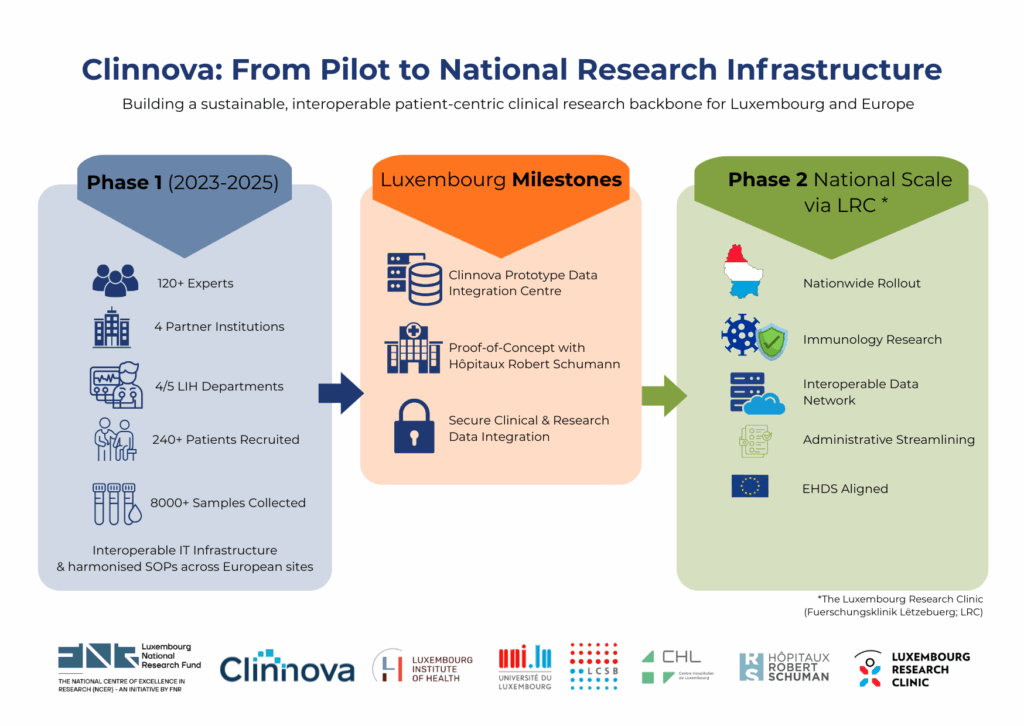 Personal data and samples from study participants will be collected and analysed as well as data from follow-up visits over five years. “Patient Reported Outcomes” as well as cognitive and mobility measurements will be recorded using the smartphone application “dreaMS” which is currently being developed and validated at the RC2NB. Biological samples (blood, cerebrospinal fluid and stool) and imaging data will initially be stored locally and then transferred to the data centre in Luxembourg, the main centre responsible for the Clinnova project.